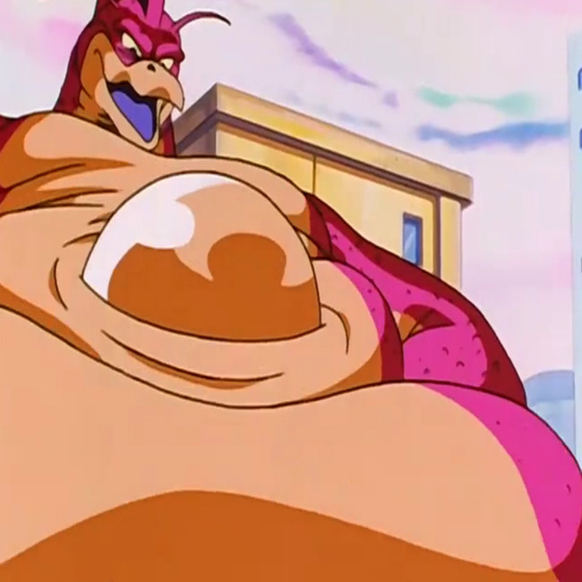 This is an image of Rage Shenron, a fictional character, a dragon created when using the Dragon Ball to revive Son Goku in the Dragon Ball manga. Rage Shenron has an extremely small height, chubby frame. He resembles a dinosaur, is red, has a beak-like face, and has a single horn on the back of his head.